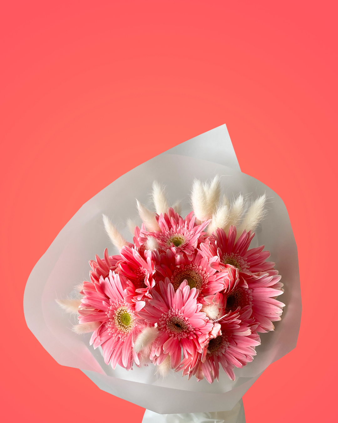 Cherry Fizz bursts with cheerful energy, showcasing vibrant Pink Gerbera Flowers paired with soft, delicate dried white bunny tails. Inspired by the refreshing fizz of a cherry soda, this bouquet blends playful texture and vivid color for a bouquet that’s both lively and elegant.